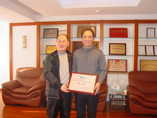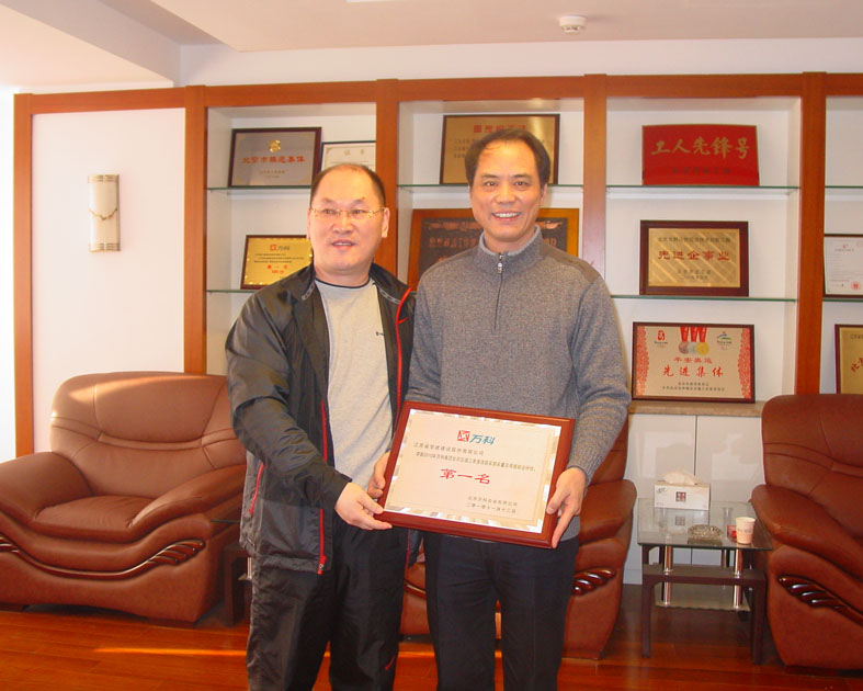 北京万科领导亲赴北京公司授牌 时间:2010-12-14 5107 北京公司在万科地产第三季度万科北京区域在建项目产品质量评估中,万科蓝山项目经专家现场实测实量,390个点合格率为99.39%,观感质量评分、质量风险评估综合得分97.35%,项目综合排名蝉联第一。12月12日上午,北京万科副总经理孔祥明率工程部经理、项目总经理等一行,特地赶到我公司,把第一名的奖牌隆重授予我公司陈荣春总经理。陈总对万科的肯定和信任表示感谢,并期望双方进一步加强友好合作,永续真诚友谊。