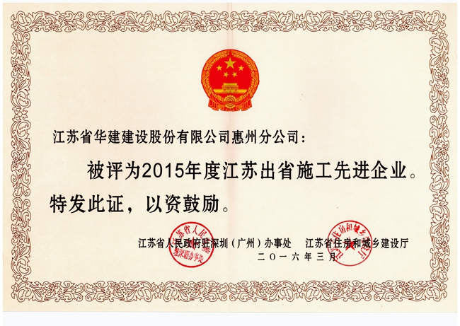 惠州公司荣获“2015年度江苏出省施工先进企业”称号 时间:2016-03-26 2860 3月24日,江苏省人民政府驻深圳(广州)办事处和江苏省住房和城乡建设厅在南宁召开2016年江苏建筑业南方区工作会议,表彰了一批施工先进企业、优秀企业经理、优秀建造师和先进个人。惠州公司获评“2015年度江苏出省施工先进企业”,总经理华恒荣被评为优秀企业经理,陈申高被表彰为质量安全先进个人,杨猛被表彰为经营财务先进个人。