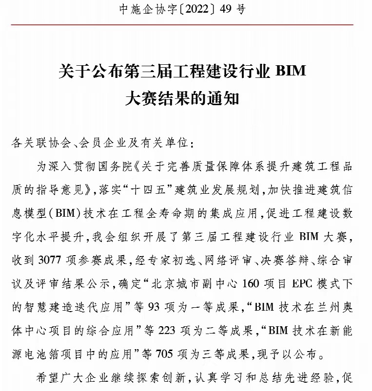 公司中海望京府项目施工阶段BIM综合应用成果荣获国家级BIM大赛三等奖 时间:2022-07-22 3320 日前,中国施工企业管理协会公布了第三届工程建设行业BIM大赛结果,“中海望京府项目施工阶段 BIM 综合应用”从全国3077项申报成果脱颖而出,获大赛三等奖。据悉,此次大赛申报项目多为规模较大公建项目的BIM应用成果,包头中海望京府作为住宅小区项目能够以排名602位获得国家级BIM大赛奖项来之不易。