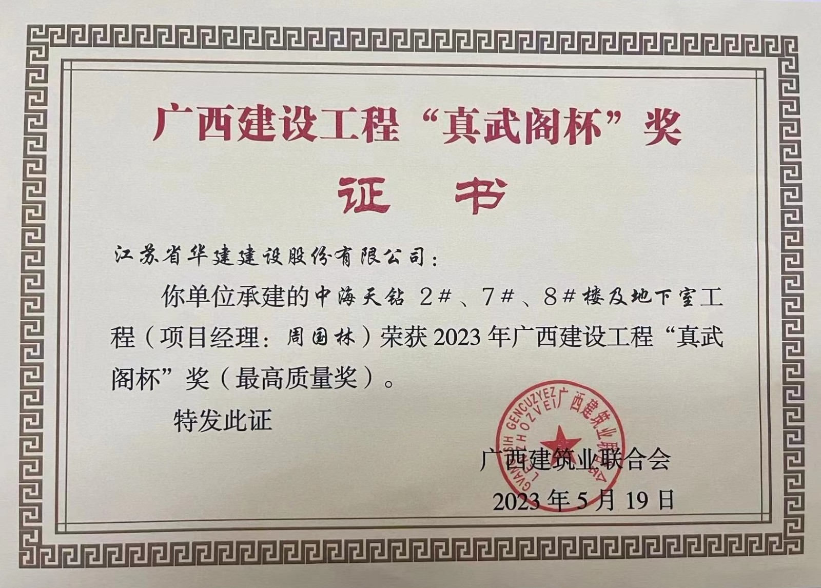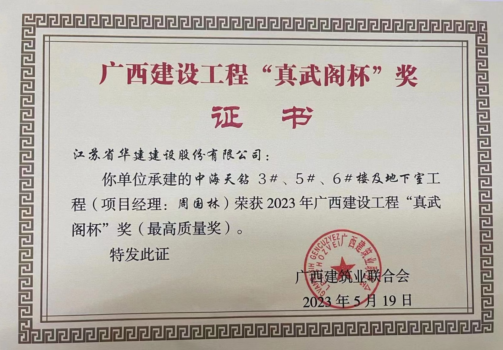 北京分公司两项工程荣获2023年广西建设工程“真武阁杯” 奖(最高质量奖) 时间:2023-06-13 2837 近日,广西建筑业联合会网站公布了《关于公布2023年广西建设工程“真武阁杯”奖(最高质量奖)工程名单的通知》,由公司承建的中海天钻3#、5#、6#楼及地下室工程、中海天钻2#、7#、8#楼及地下室工程名列榜单。下一步,公司将进一步提高创新创优意识,提升项目精细化管理水平,以匠心精神打造更多优质工程,持续擦亮华建品牌。