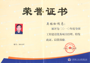 富有成效的工作,一丝不苟的精神,赢得了多方的肯定和褒奖。2010年被评为广东省优秀项目经理,2011年被评为全国项目经理。