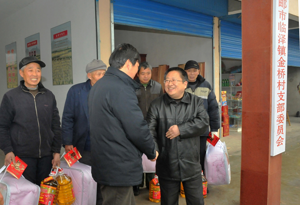 公司领导节前扶贫慰问 时间:2010-02-10 5498 2月10日,公司副总经理程杰一行冒雨赴公司对口扶贫的高邮临泽镇金桥村进行走访慰问。程总参观了由我公司支持建成的金桥村村民服务中心,了解去年该村的基本情况和今年的发展打算,程总希望金桥村今后要在扶持特色产业上作文章,努力形成自力更生,自我造血的能力。随后,程总看望了当地低收入贫困农户,给他们送去节日的问候和慰问品。 金桥村地处里下河地区腹地,位于高邮、宝应、兴化三县交界处。从2008年公司定点扶贫该村以来,公司着力帮扶改善交通环境,发展高效农业,取得一定成绩,受到市扶贫办的肯定。
