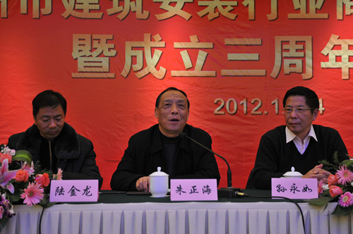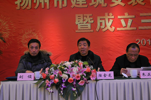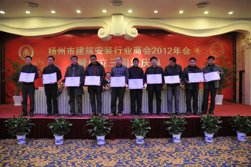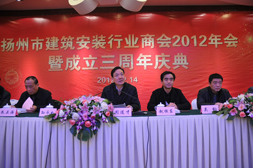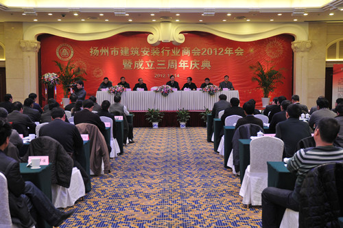 12月14日下午,扬州市建筑安装行业商会在扬州西园饭店举办2012年会暨成立三周年庆典大会,市人大副主任、市工商联主席、市总商会会长孙永如,市政府副市长闻道才,市政协原副主席、市建安商会名誉会长朱正海,市工商联党组书记、副主席、市总商会副会长赵振东,市工商联副主席吴钧等领导出席,市城建局、民政局、工商联相关部门负责人,相关兄弟商会、协会负责人以及建安商会所有会员单位负责人等近120人参加会议,市建安商会会长陆金龙主持。