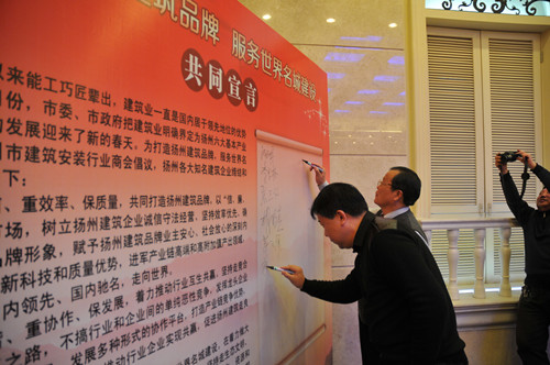 建安商会常务副会长吴士茂代表商会理事会作工作报告,秘书长戴壮民介绍了华建联盟成立一年来的运行情况,主席台上的各位领导为10个新进会员代表颁发证书。副会长曹德荣宣读了市建安商会《打造“扬州建筑”品牌,服务世界名城建设共同宣言》,然后所有会长单位负责人一起上台签署《共同宣言》,表达了共同打造扬州建筑品牌、抱团包容发展、担当建设秀美扬州生力军的共同愿望。