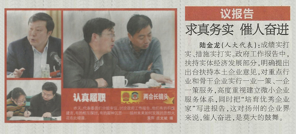 元月7日的《扬州日报》焦点新闻栏目报道了我公司董事长陆金龙参加扬州市七届人大二次会议的有关情况。本次人代会6日上午在扬州会议中心隆重开幕,作为市人大代表,陆董事长在会上认真参与对朱民阳市长代表政府所作工作报告的讨论,并围绕“六个基本”抓发展、合力推进“三个扬州”和世界名城建设、加快建设更高水平小康社会积极建言献策。《扬州日报》在人大代表“议报告”中第一个刊登了陆董事长的发言:“成绩实打实、措施实打实。政府工作报告中,扶持实体经济发展部分,明确提出出台扶持本土企业意见,对重点行业和骨干企业实行一业一策、一企一策服务,高度重视建立微小企业服务体系,同时把‘培育优秀企业家’写进报告,这对扬州的企业界来说,催人奋进,是莫大的鼓舞。”