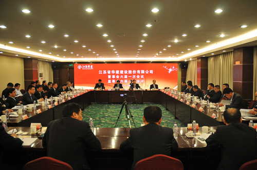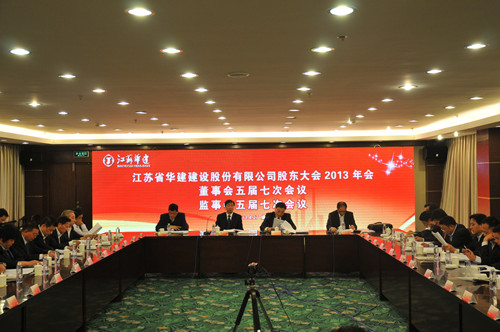 4月27日下午,江苏省华建建设股份有限公司股东大会2013年会暨董事会、监事会五届七次会议在扬州召开。会议由陆金龙董事长主持,10名股东代表、11名董事、4名监事出席会议,公司高级管理人员、各分支机构和总部各部室负责人、公司律师团代表列席会议。会议听取和审议通过了副董事长、总经理宗有农同志所作的董事会和经营层工作报告,监事会主席吴士茂所作的监事会工作报告,公司总会计师李长栋同志所作的《关于2012年度财务决算和2013年度财务预算方案的报告》和《关于2012年度股利分配方案的报告》。