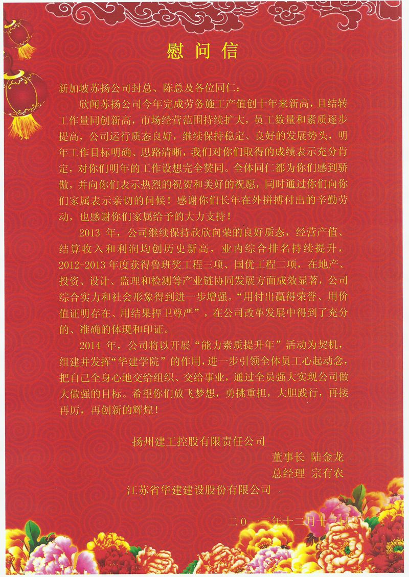 公司董事长、总经理发慰问信鼓励新加坡苏扬公司再接再厉 时间:2013-12-13 3587 12月中上旬,公司总部完成了对国内各区域公司的年终走访调研。新加坡苏扬公司则通过电子稿汇报了2013年工作情况及下年度工作思路。2013年新加坡苏扬公司主要经济指标创历史新高;队伍规模保持稳定;班组承包责任制成果显著;市场份额持续扩大。总部认为这一年来苏扬公司保质态,扩市场,稳增长,取得了不俗成绩,公司董事长陆金龙、总经理宗有农特发慰问信鼓励苏扬公司再接再厉,再创新高!慰问信全文如下: