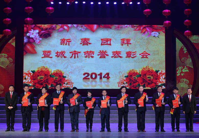 在1月12日晚扬州市委、市政府召开的2014新春团拜暨城市荣誉表彰会上,公司副董事长、总经理宗有农当选为“扬州市十大功臣”,扬州市委书记谢正义亲自为宗有农总经理颁奖。