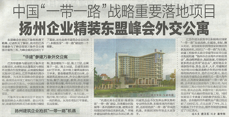 9月12日《扬州晚报》刊载华建东盟峰会外交公寓项目消息 时间:2016-09-12 3913 近日,东盟峰会在老挝万象刚刚落下帷幕。9月12日,《扬州晚报》A7版刊载题为《中国“一带一路”战略重要落地项目 扬州企业精装东盟峰会外交公寓》的文章,详细报道华建积极践行国家“一带一路”战略,承建东盟峰会场馆万象外交公寓精装修工程的有关情况。