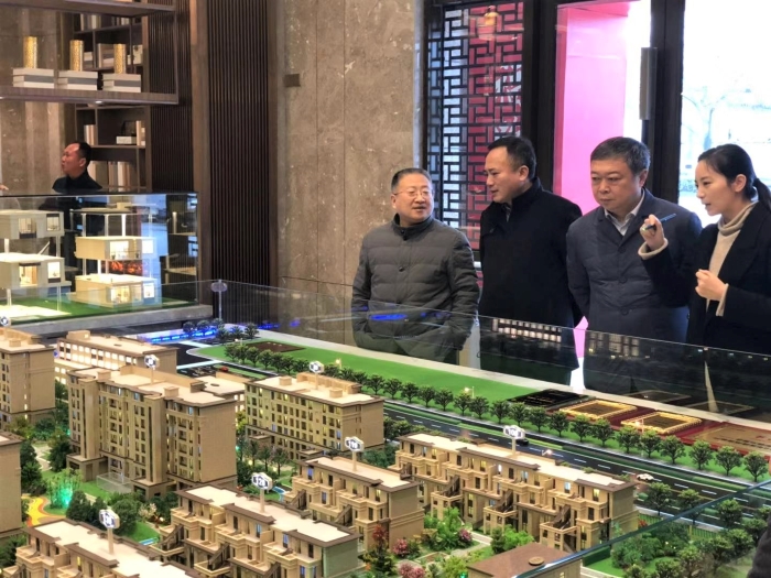 王宏董事长首先考察了华建乾院项目,在售楼处听取了项目开发、销售的进度报告,详细了解了小区户型特点和配套情况,并针对一些产品细节提出完善意见。