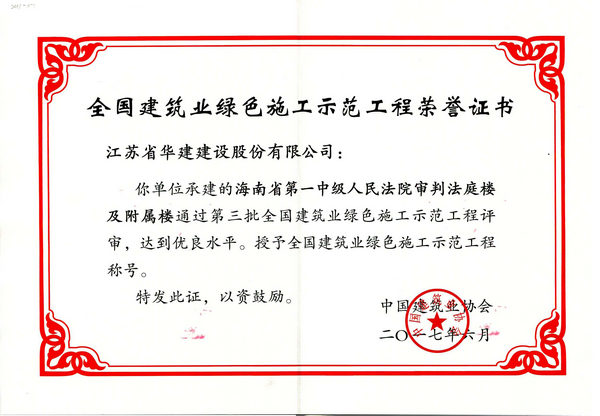 6月28-29日,中国建筑业协会绿色建造与施工分会在山东省济南市举办全国建筑业绿色施工创新发展经验交流会,对经竣工评审合格的工程颁发全国建筑业绿色施工示范工程证书。由海南公司承建的“海南省第一中级人民法院审判法庭楼及附属楼”项目首次荣获第三批“全国建筑业绿色施工示范工程”称号。