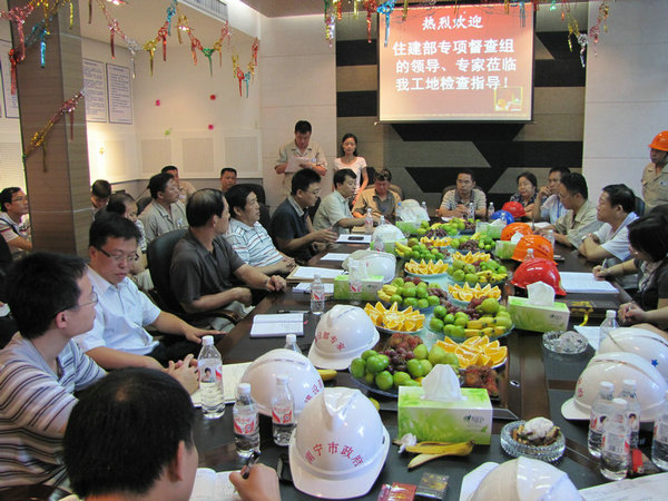 住建部建筑施工安全专项督查组检查指导广西丽原•天际城项目 时间:2010-10-14 5073 9月18日上午,国家住房城乡建设部建筑施工安全专项督查组莅临我公司广西丽原·天际城工地检查指导工作,勘察了施工现场的实体安全状况,查阅了施工质量安全技术资料,检查了我公司的资质、安全许可、三类人员与特种作业人员持证的情况。项目部的安全防护与文明施工工作受到了督查组的一致好评,住建部工程质量安全监管司王树平副司长在知道我们争创“鲁班奖”的情况后,提出了许多宝贵的意见,并预祝我们的质量目标得以圆满实现。 另讯,此前丽原·天际城工程项目被评为2010年上半年广西自治区文明工地。