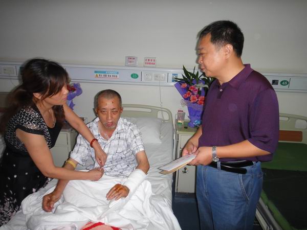 7月13日上午,开云网页版页面登录副总经理、宜昌市扬州商会会长王宏、宜昌分公司总经理吕进、第一工程处主任唐生健等一行,前往市二医院看望香格里拉小区保安——英雄付永喜,并给他送去了慰问金。