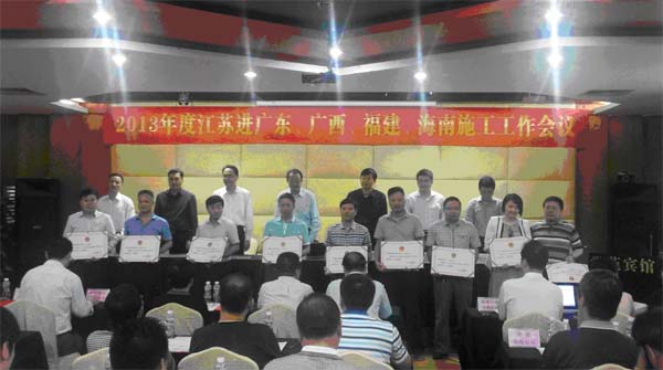 海南分公司荣获2013年江苏进粤、桂、闽、琼施工先进企业 时间:2014-04-28 3747 4月25日,2013年度江苏进广东、广西、福建、海南施工工作会议在珠海市市委党校学苑宾馆召开。会上,海南分公司荣获“2013年江苏进粤、桂、闽、琼施工先进企业”,高家驯被表彰为“2013年江苏进粤、桂、闽、琼施工优秀企业经理”,1人被评为优秀建造师、2人分别被评为质量安全和经营财务管理先进个人。 另讯:4月19日,从中国施工企业管理协会第29次年会传来喜讯,海南公司匡新益被评为2013年度“全国工程建设优秀项目经理”。