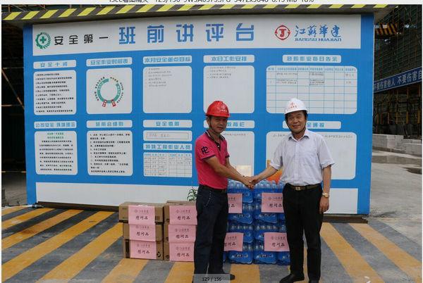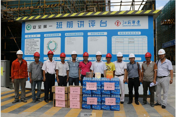 区域公司领导赴三亚工地进行高温慰问 时间:2015-06-20 3116 6月19日上午,海南分公司党总支副书记沈巨青带队,在分公司工会代表等相关部门陪同下,走访慰问了三亚妇幼保健院项目部,看望了坚守岗位奋战在高温一线的项目部人员,并给他们送去了矿泉水、洗漱用品和防暑药品。 慰问组一行实地了解项目部的进展情况以及现场人员的食、住、行、业务学习安排等情况,叮嘱大家在高温季节要切实加强现场管理,绷紧安全弦,确保平稳有序生产。