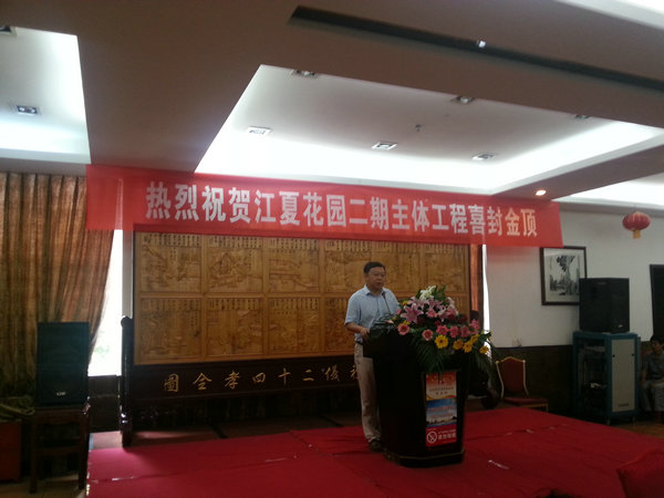 湖北公司江夏花园二期项目顺利封顶 时间:2015-06-30 2739 6月28号,是湖北分公司值得庆祝的日子:公司在武汉市承建的第一个民用住宅江夏花园二期工程顺利封顶。该工程项目地处居民集中区,其施工空间狭小,工期紧迫。湖北公司组织强有力的项目管理团队,精心筹备,克服各种困难,保质保量的完成了工程既定目标。 公司副总经理、海南区域公司总经理王宏出席封顶仪式并致辞,对各参建单位表示感谢,对项目部取得的成绩表示肯定并希望大家再接再厉,确保顺利竣工。