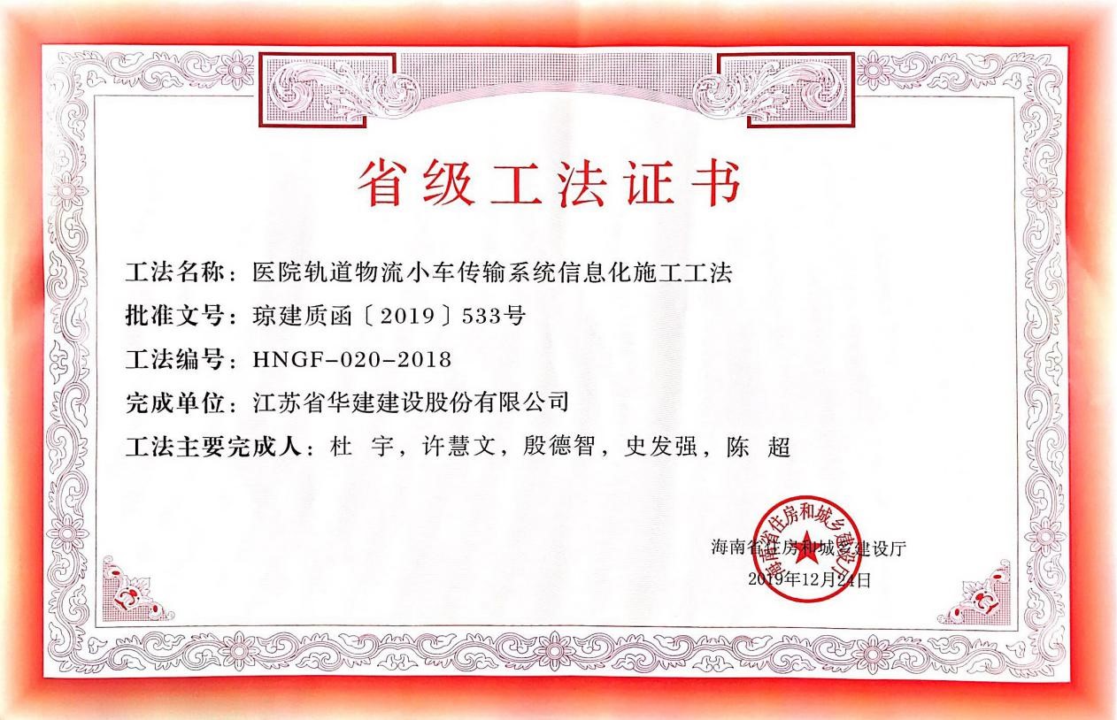 海南分公司新增1项省省级工法 时间:2020-01-10 3490 2019年12月24日,海南省住房和城乡建设厅公布了2018年度海南省省级工法评审结果,我司《医院轨道物流小车传输系统信息化施工工法》成功入选。