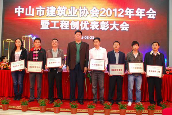 龙湾花园一期项目荣获“中山市安全生产文明施工优良样板工地”称号 时间:2012-04-11 4978 龙湾花园一期项目荣获“中山市安全生产文明施工优良样板工地”称号 2012年3月23日,中山市建筑业协会召开了“2012年年会暨工程创优表彰大会”。与会501家会员单位中,共有25个项目获得了“中山市建设工程安全生产文明施工优良样板工地”称号,由珠海区域公司中山分公司施工的“龙湾花园一期”工程项目榜上有名。 珠海区域公司中山分公司总经理严正涛(右一)在表彰会现场领取奖牌