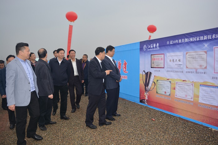 随后,广安市委常委、组织部长黄秀川宣布项目开工,现场燃放礼炮,机械鸣笛,到会领导及项目业主代表共同为项目培土奠基。仪式结束后,各领导来到项目展板前,详细了解了本次开工项目有关情况,当经过现场通道旁布置的华建展示栏时,黄部长一行还兴致盎然地听取了严总关于公司情况的介绍。