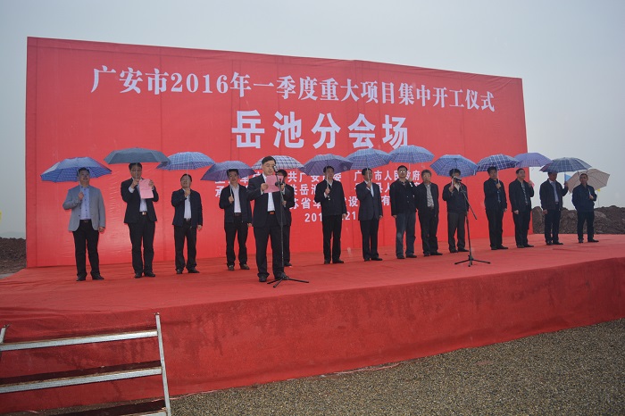 3月21日上午,广安市2016年一季度重大项目集中开工仪式岳池分会场在岳池城东新区隆重举行,以公司岳池城东新区基础设施、智慧城市及海绵城市建设PPP项目为代表的一批项目正式开工建设。广安市委常委、组织部长黄秀川、副市长席世洪,岳池县委副书记、县长汤才勇等领导,广安市住建、交通、水务等部局负责人,岳池县人大、政协及县住建、发改等多个部局负责人出席活动。岳池县委常委、常务副县长钟爱平主持仪式。