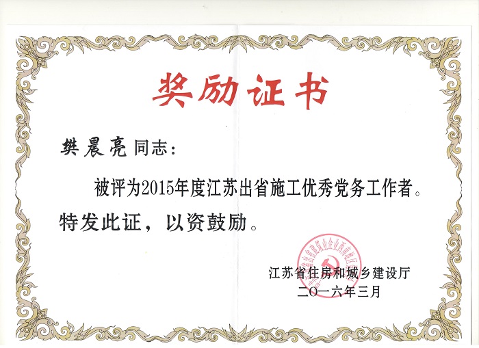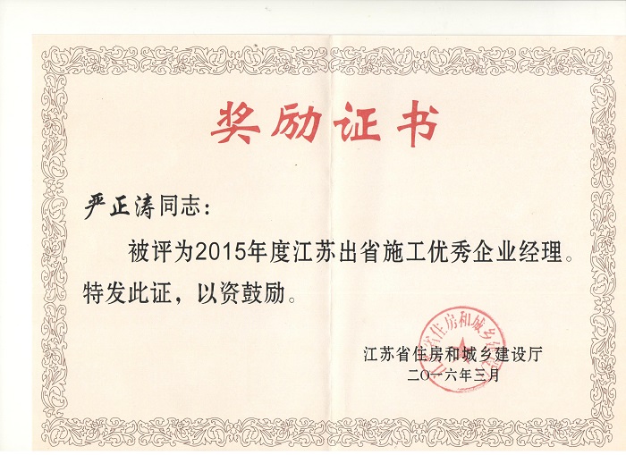 重庆分公司被表彰为“2015年度江苏出省施工先进企业” 时间:2016-04-20 2861 近日,重庆分公司被江苏省住房和城乡建设厅表彰为“2015年度江苏出省施工先进企业”,重庆分公司总经理严正涛荣获“2015年度江苏出省施工优秀企业经理”称号,樊晨亮被评为“2015年度出省施工优秀党务工作者”。