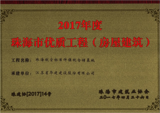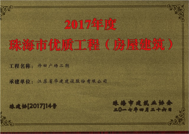 公司2项目获评珠海市房屋建筑优质工程 时间:2017-05-16 3667 近日,珠海市建筑业协会发文公布2017年度珠海市优质工程名单,我司承建的珠海航空标准件保税仓储基地和丹田广场二期的2个项目榜上有名。