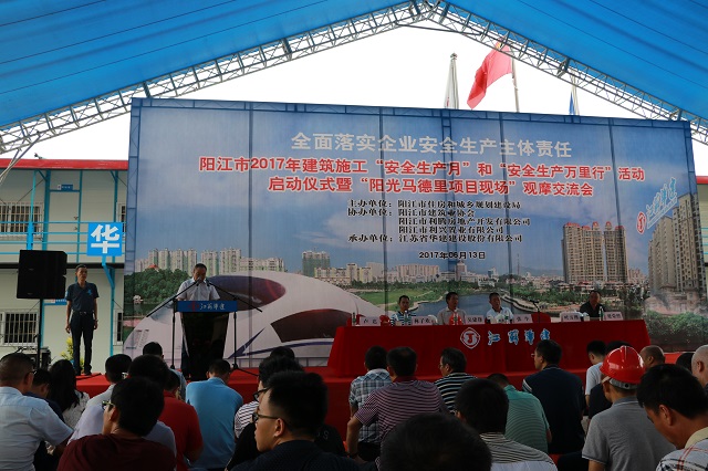 6月13日,2017年阳江市建筑工程安全生产文明施工示范工地现场观摩会在阳江公司阳光马德里项目隆重举行。阳江市住房规划建设局分管安全生产副局长,建管科、市质安监站全体人员,市建筑协会负责人,各县(市、区)住房规划建设局分管安全生产副局长,建管股股长、质安监站站长,市直各施工企业和监理企业分管安全生产领导、质安部门负责人,以及全市600余位建设施工企业代表参加大会并观摩阳光马德里施工现场。