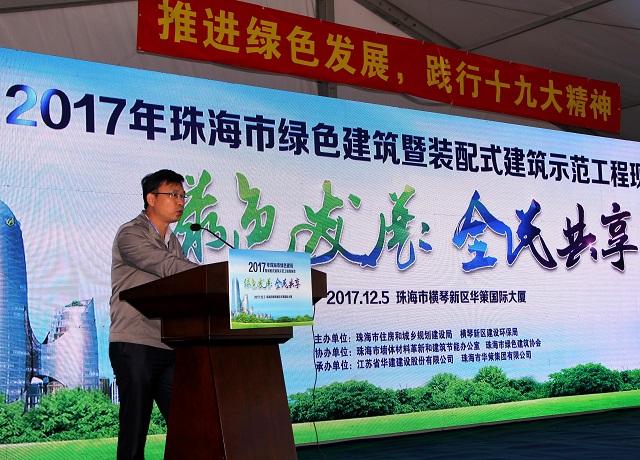 “2017年珠海市绿色建筑暨装配式建筑示范工程现场会” 于12月5日在我司承建的横琴新区华策国际大厦项目现场成功举行。珠海市住房和城乡规划建设局组织召开本次现场会。会议以“推进绿色发展,践行十九大精神”为主题,以加快建设生态环保城市,深入开展创建全省绿色建筑和装配式建筑示范工程宣贯活动,扎实推进珠海市绿色建筑和装配式建筑的发展,利用标杆示范的力量激励建筑企业创精品工程,促进绿色生态建筑建设管理水平跃升为目的。珠海市住房和城乡规划建设局总工程师毛建华、横琴新区建设环保局副局长温卫军、珠海市墙体材料革新和建筑节能办公室主任徐志明、副主任陈朝晖、我公司副总经理兼总工程师周学军出席了本次会议。市住规建局领导及相关科室工作人员、各区(经济功能区)建设行政主管部门分管领导及相关科室工作人员、市(区)节能办、质检站负责人及中层管理人员、全市主要建筑规划、设计单位、房地产开发企业、审图机构、建筑施工企业、建筑监理企业代表及媒体记者等近200人参加了此次现场观摩会。
