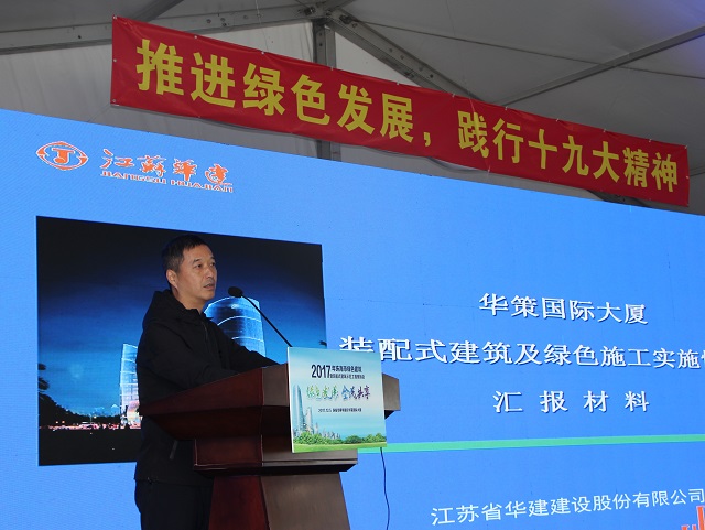 公司总工周学军在现场会上对华策国际大厦工程绿色施工和装配式技术应用情况进行了介绍