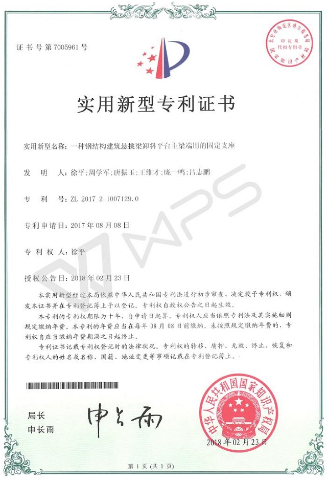 公司新获一项国家实用新型专利授权 时间:2018-03-09 2722 近日,从国家知识产权局传来喜讯,公司申请的《一种钢结构建筑悬挑梁卸料平台主梁端用的固定支座》获得实用新新型专利授权。 该专利取材于公司标杆项目华策国际大厦,在建筑钢结构悬挑梁卸料平台主梁端固定支座的安装施工中,技术人员创造性地设计了一种结构简单、便于拆装且无需对建筑进行安装预处理的固定支座。该支座能够配合现有的较为先进的建筑方式,大幅提高施工效率,并降低安装、拆卸过程中的安全风险。