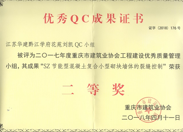 近日,重庆市建筑业协会发文表彰了一批优秀QC成果,开云网页版页面登录黔江学府花苑刘凯QC小组被评为2017年度重庆市工程建设优秀质量管理小组,其成果“SZ节能型混凝土复合小型砌块墙体的裂缝控制”荣获二等奖。