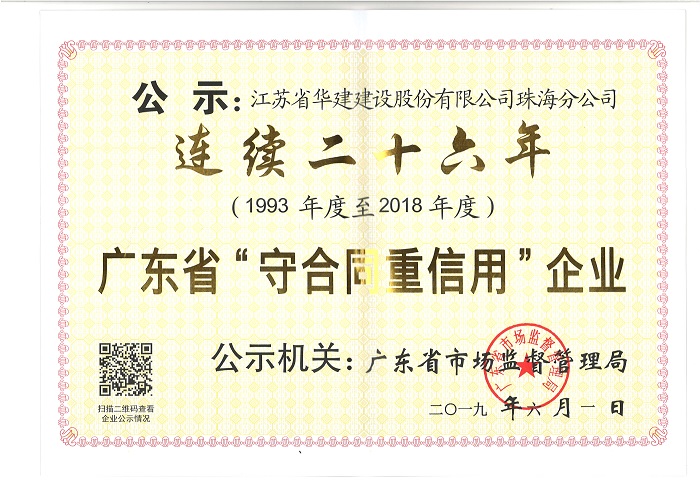 公司连续二十六年被广东省市场监督管理局表彰为“守合同重信用企业” 时间:2019-07-01 3212 近日,珠海分公司被广东省市场监督管理局(原公示机关为广东省工商行政管理局)授予“连续二十六年守合同重信用企业”荣誉称号。