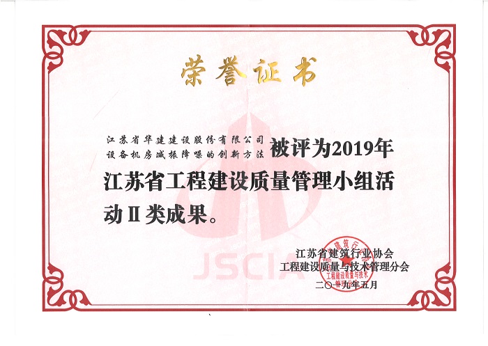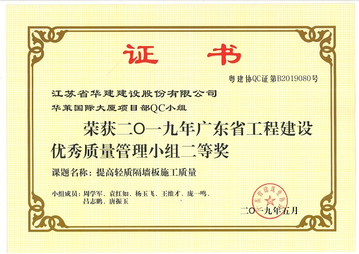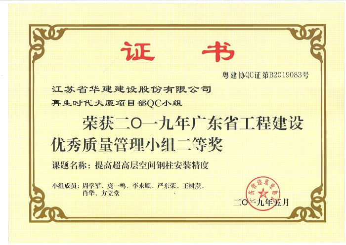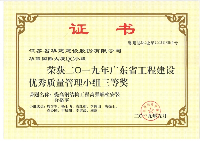 公司新添4项省级工程建设优秀QC成果 时间:2019-07-11 3622 近期,广东省建筑业协会发文公布了2019年度广东省工程建设优秀质量管理小组名单,公司华策国际大厦项目部QC小组“提高轻质隔墙板施工质量”、再生时代项目部QC小组“提高超高层空间钢柱安装精度”两项成果喜获二等奖,华策国际大厦项目部QC小组“提高钢结构工程高强螺栓安装合格率”荣获三等奖。 华策国际大厦项目部QC小组“设备机房减振降噪的创新方法”成果在江苏省建筑业协会组织的2019年度江苏省工程建设质量管理小组活动中荣获二等奖。