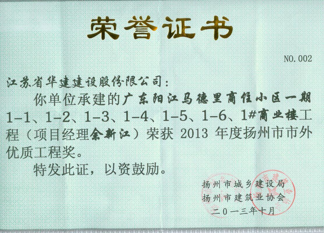 2013年阳江阳光马德里项目扬州市市外优质工程奖