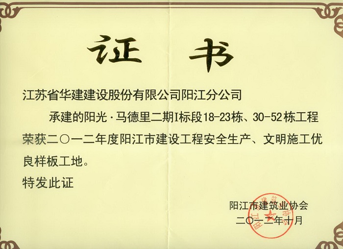 2012年阳光马德里二期阳江市建设工程安全生产、文明施工优良样板工地