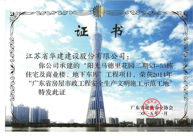 阳光马德里二期工程荣获2014年广东省房屋市政工程安全生产文明施工示范工地