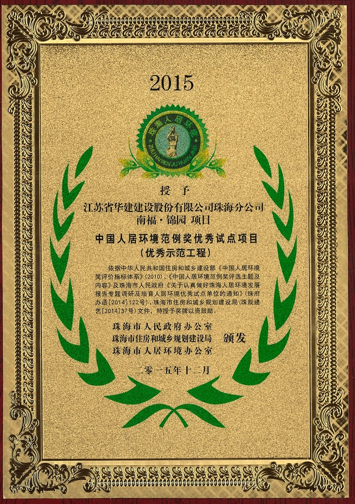南福锦园荣获中国人居环境范例奖优秀试点项目(优秀示范工程)