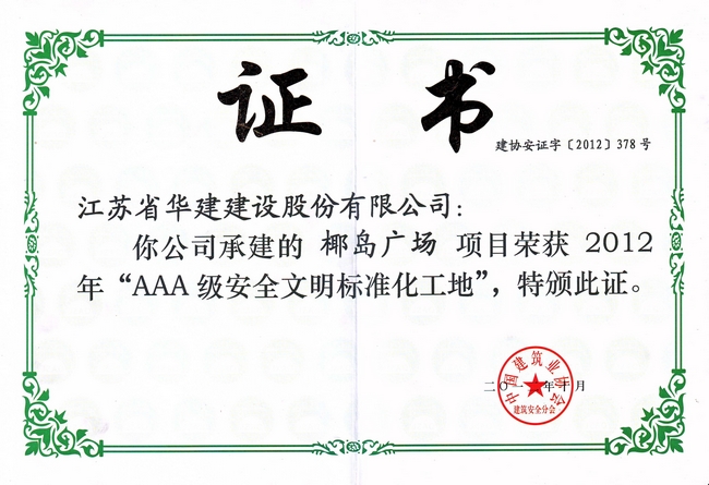 椰岛广场 时间:2013-01-17 11137 椰岛广场项目位于海口市龙华路,该工程总建筑面积115562平方米,其中地下室建筑面积20388平方米,1#-4#楼地上建筑面积58689平方米,建筑高度93.35米,5#-6#楼地上建筑面积36485平方米,建筑高度96.45米。工程于2011年4月30日开工,工期为480天。 2012年10月,该工程被中建协评为2012年“AAA级安全文明标准化工地”。