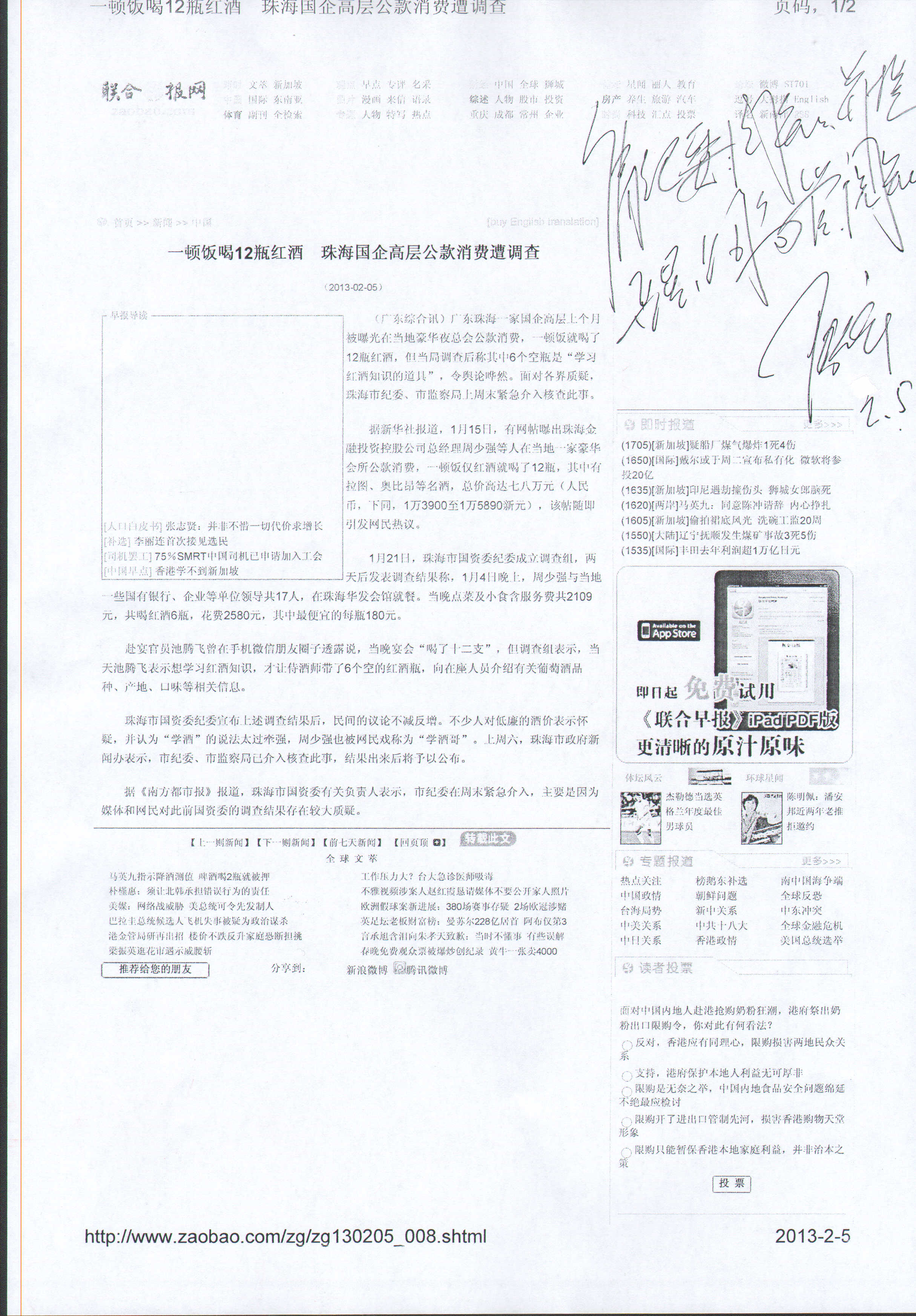 陆金龙董事长对网载“珠海国企高层公款消费”作出批示,提醒公司高管引以为戒 时间:2013-02-06 8190 陆金龙董事长对网载“珠海国企高层公款消费” 作出批示,提醒公司高管引以为戒 2月5日联合早报网登刊信息“一顿饭喝12瓶红酒珠海国企高层公款消费遭调查”,陆金龙董事长即日批示:“请纪委阅知,并提醒公司高管阅知”。公司纪委、纪监室也当即将此精神向公司上下作了传达,要求严格按公司廉政细则十二条办事,如有违犯将层层追究责任。