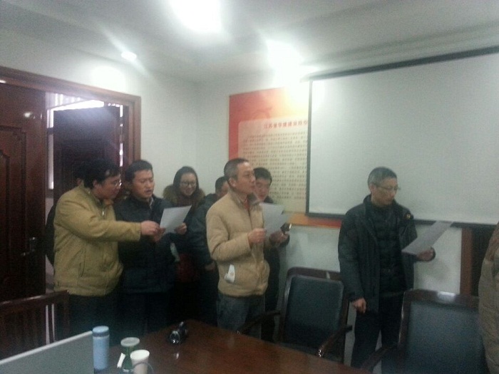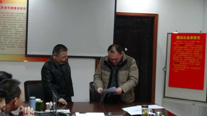 盐城华建置业公司总经理缪文明、支部书记周群利代表全体员工表态:公司经营层要带头执行公司各项规定,遵纪守法,廉洁自律,把廉洁从业承诺书落到实处。