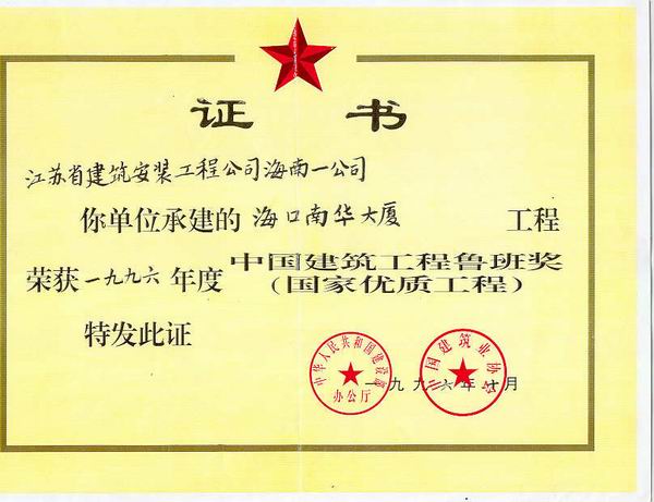海口市南华大厦工程于1994年5月竣工,1995年6月被评为海南省优质样板工程,1995年12月被评为建设部优质样板工程,1996年10月荣获鲁班奖。